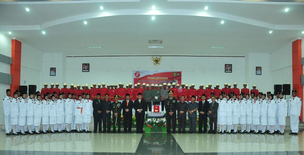 RENGAT - Bupati Indragiri Hulu (Inhu) H Yopi Arianto mengukuhkan 38 anggota Paskibraka Kabupaten Inhu, Selasa (16/8) malam di Gedung Dang Purnama Rengat. Pengukuhan anggota Paskibraka ini ditandai dengan pemasangan kendit dan pembacaan ikrar.